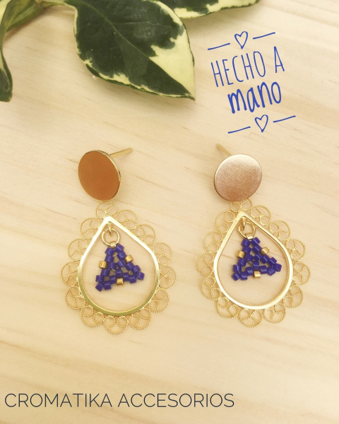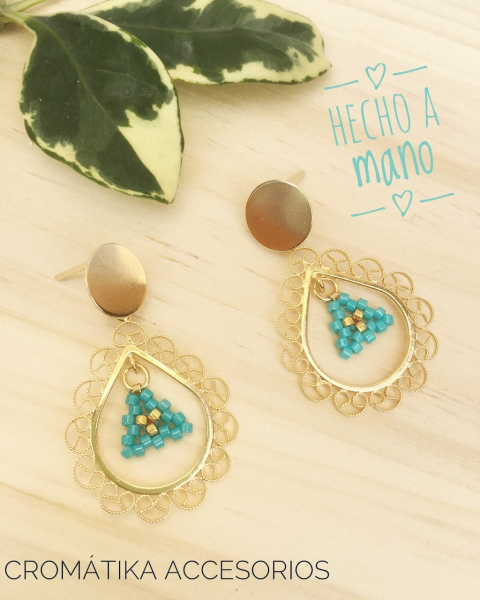 Aretes tejidos a mano con delicas marca Miyuki y herrajes en filigrana de oro goldfilled.