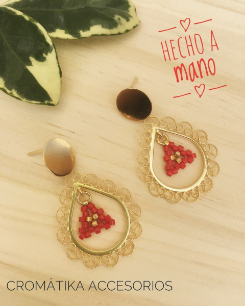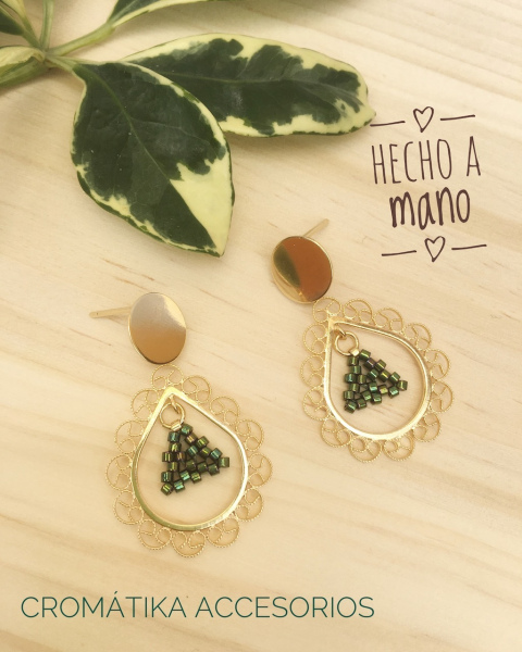 Aretes tejidos a mano con delicas marca Miyuki y herrajes en filigrana de oro goldfilled.